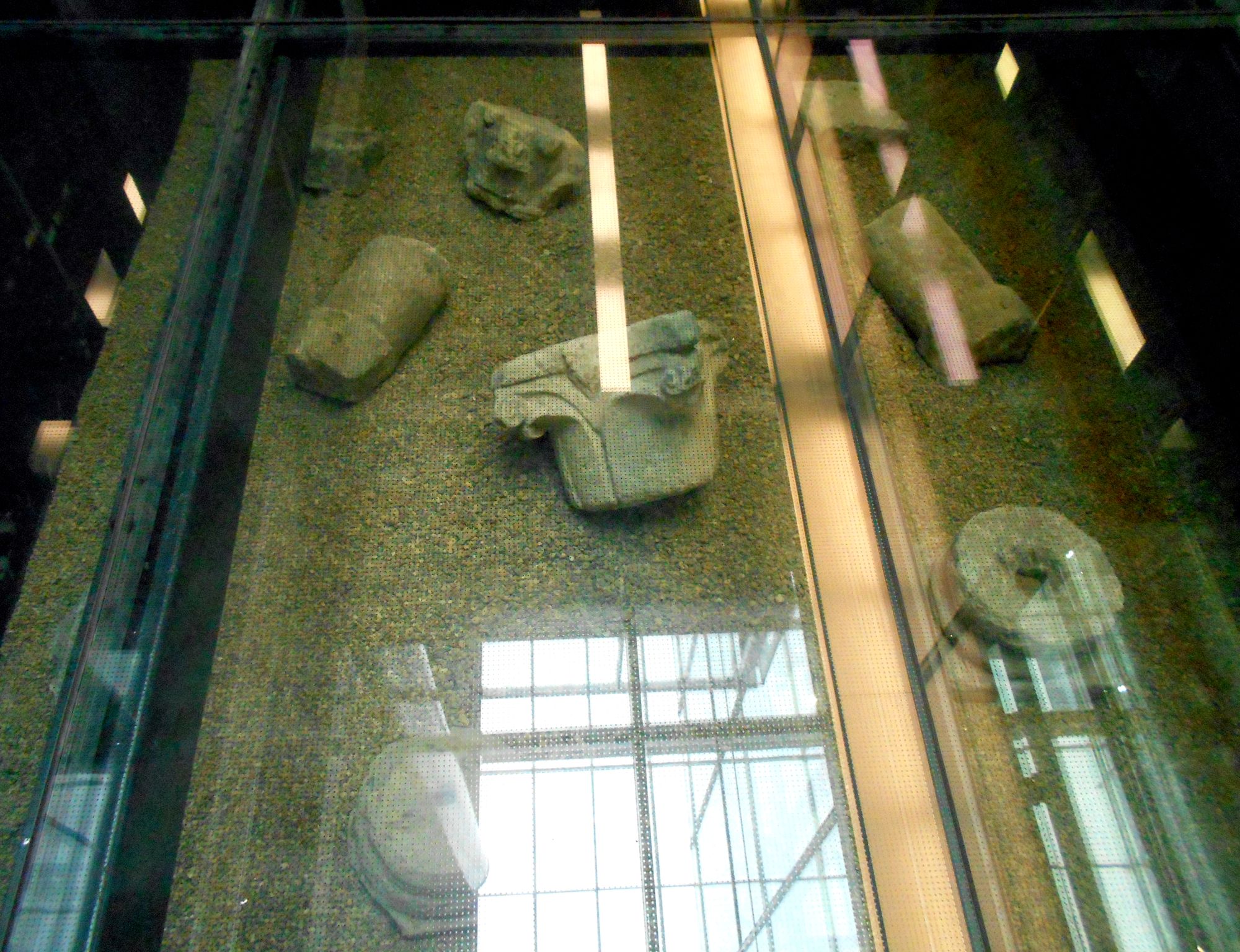 Rukovođeni praksom konzervacije arheološkog nasleđa u vidu njegove inkorporacije u moderna zdanja urbanih jezgara širom Evrope, nadležni su u staklenim basenima na ulazu u ovaj objekat iz Knez Mihailove ulice izložili nađeni materijal. Međutim, postavku je odmah po otvaranju ugrozio kondenz formiran na staklenim oknima basena, a saznalo se i da neki izloženi elementi uopšte ne potiču sa same lokacije, već su doneseni sa drugih lokaliteta rimskog Singidunuma, čineći nalazište arheološkim “mešanim mesom”.